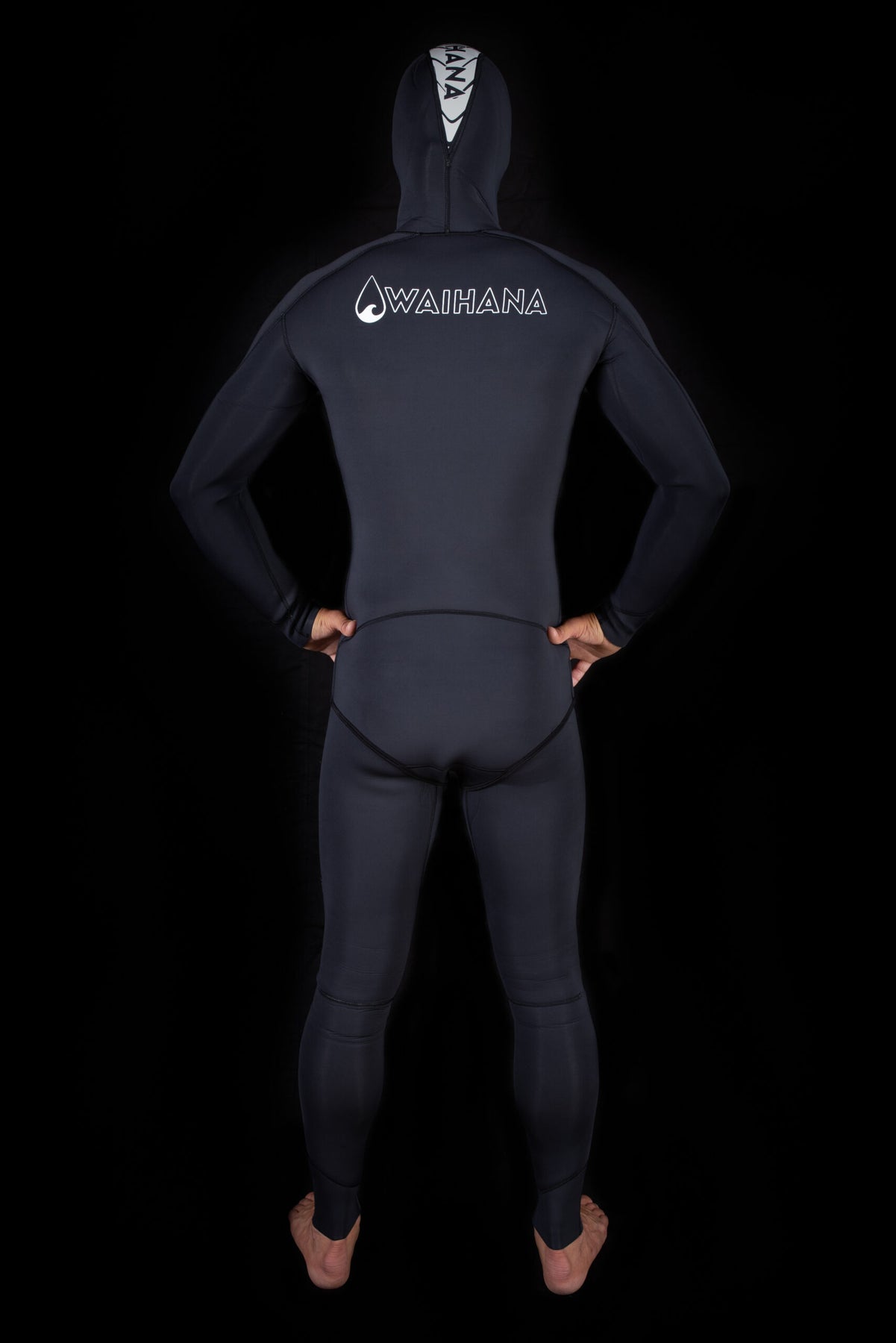 Built on the extreme success of the Goliath Grouper and Kajiki Performance Spearfishing wetsuits, our bold new Essentials line expertly marries form with function.  WAIHANA ESSENTIALS features quality craftsmanship, superb design and an entry-level price point that other wetsuit manufacturers simply cannot match. The WAIHANA ESSENTIALS wetsuit is available in our full range of men's and women's sizes.  The suit incorporates a high visibility hood, safety whistle, and smooth skin seals at the ankles, wrists, and hood opening.  Inside, the suit is lined with ultra stretch fabric for comfort and ease of donning without lubricant.